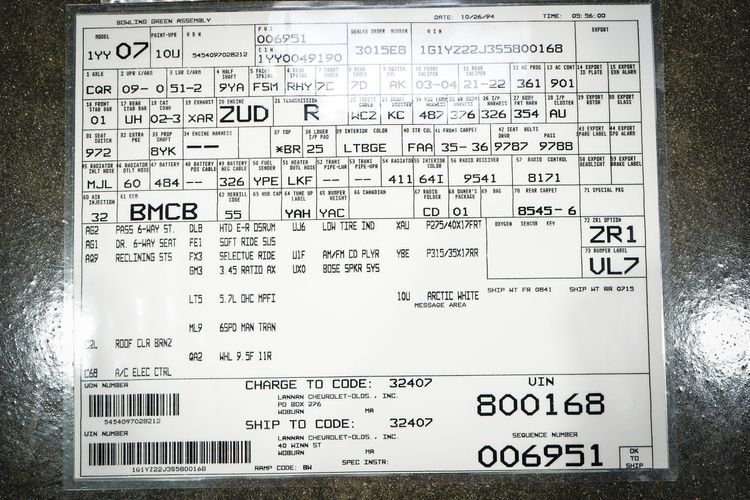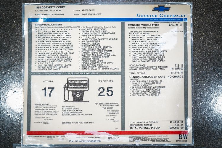 FREE NATIONWIDE ENCLOSED DELIVERY! ON SALE NOW! ONLY 2K MILES! 1 OF ONLY 9 EVER MADE! NCRS TOP FLIGHT AWARD! R3 MOTORCARS IS PROUD TO PRESENT THIS LAST YEAR C4 CORVETTE ZR-1 COUPE WITH ONLY 2K MILES! THIS VETTE COMES WITH A PERFECT CERTIFIED CARFAX AND AUTO CHECK HISTORY REPORT. THE ARCTIC WHITE EXTERIOR AND LIGHT BEIGE INTERIOR ARE SHOWROOM NEW! THIS IS A VERY RARE AND GORGEOUS COLOR COMBO. ONLY 41 ARCTIC WHITE ZR-1'S WERE BUILT IN 1995 AND ONLY 9 HAD BEIGE INTERIOR! THIS ZR1 COMES WITH THE ZR-1 SPECIAL PERFORMANCE PKG ($31,248), DUAL ROOF PKG ($950), 16 WAY PWR SEATS, CD, ADJUSTABLE RIDE CONTROL, PWR WINDOWS AND LOCKS, OWNERS MANUAL, 6.2L 405HP ENGINE, 6SP MANUAL TRANSMISSION, BOOKS, ORIGINAL WINDOW STICKER, AND MORE! PRICED RIGHT AND READY TO GO!! PLEASE CALL ME WITH ANY QUESTIONS. THANKS.