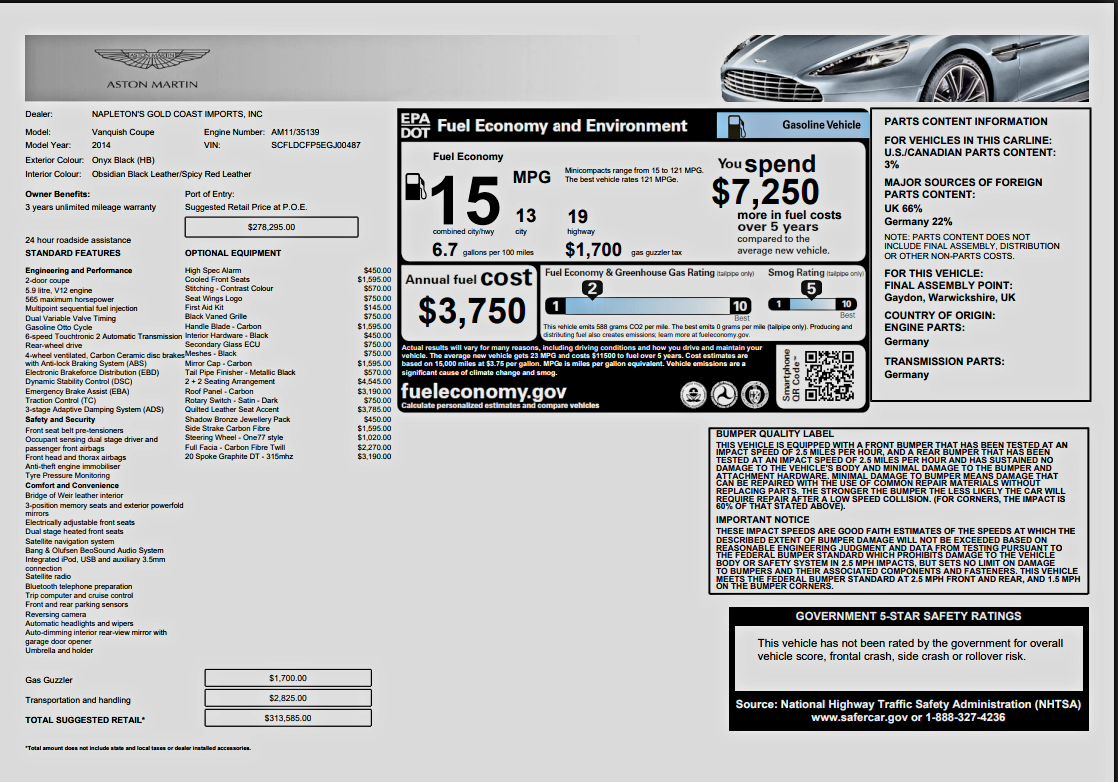 FREE NATIONWIDE ENCLOSED DELIVERY! ON SALE NOW! HUGE $313,585 MSRP! SUPER RARE! 1 OF THE LOWEST MILEAGE EXAMPLES ON THE MARKET CURRENTLY! R3 MOTORCARS IS PROUD TO PRESENT THIS EXTREMELY RARE 2014 ASTON MARTIN VANQUISH V12 COUPE WITH ONLY 3K MILES. THE ONYX BLACK EXTERIOR AND OBSIDIAN BLACK/SPICY RED LEATHER INTERIOR ARE SHOWROOM NEW. THIS VANTAGE COMES WITH A PERFECT CERTIFIED 2 OWNER CARFAX AND AUTOCHECK HISTORY REPORT. THE TWIN TURBO 6.0L V12 WITH 565HP IS A THRILL TO DRIVE! I'VE DRIVEN EVERY EXOTIC AND PERFORMANCE CAR OUT THERE AND THIS CAR IS THE COMPLETE PACKAGE OF ELEGANCE AND PERFORMANCE! LOADED WITH FACTORY OPTIONS INCLUDING THE 2+2 SEATING ARRANGEMENT ($4,545), QUILTED LEATHER SEAT ACCENT ($3,785), CARBON FIBER ROOF PANEL ($3,190), 20 SPOKE GRAPHITE WHEELS ($3,190), FULL FACIA CARBON FIBER TWILL ($2,270), COOLED FRONT SEATS ($1,595), HANDLE BLADE IN CARBON ($1,595), MIRROR CAPS IN CARBON ($1,595), SIDE STRAKE CARBON FIBER ($1,595), STEERING WHEEL ONE77 STYLE ($1,020), SEAT WINGS LOGO ($750), BLACK VANED GRILLE ($750), SECONDARY GLASS ECU ($750), MESHES BLACK ($750), ROTARY SWITCH DARK SATIN ($750), STITCHING IN CONTRAST COLOR ($570), TAIL PIPE FINISHER IN METALLIC BLACK ($570), HIGH SPEC ALARM ($450), INTERIOR HARDWARE BLACK ($450), SHADOW BRONZE JEWELRY PACK ($450), FIRST AID KIT ($145), NAVIGATION, BACK UP CAMERA, PWR WINDOWS AND LOCKS, TILT, CRUISE, 6SP AUTOMATIC TRANSMISSION WITH PADDLE SHIFTERS, BOOKS, AND BOTH KEYS. JUST SERVICED AND READY TO GO. EXTENDED WARRANTIES AVAILABLE. SUPER COMPETITIVE FINANCING RATES AVAILABLE WITH APPROVED CREDIT. PLEASE CALL ME WITH ANY QUESTIONS. THANKS.