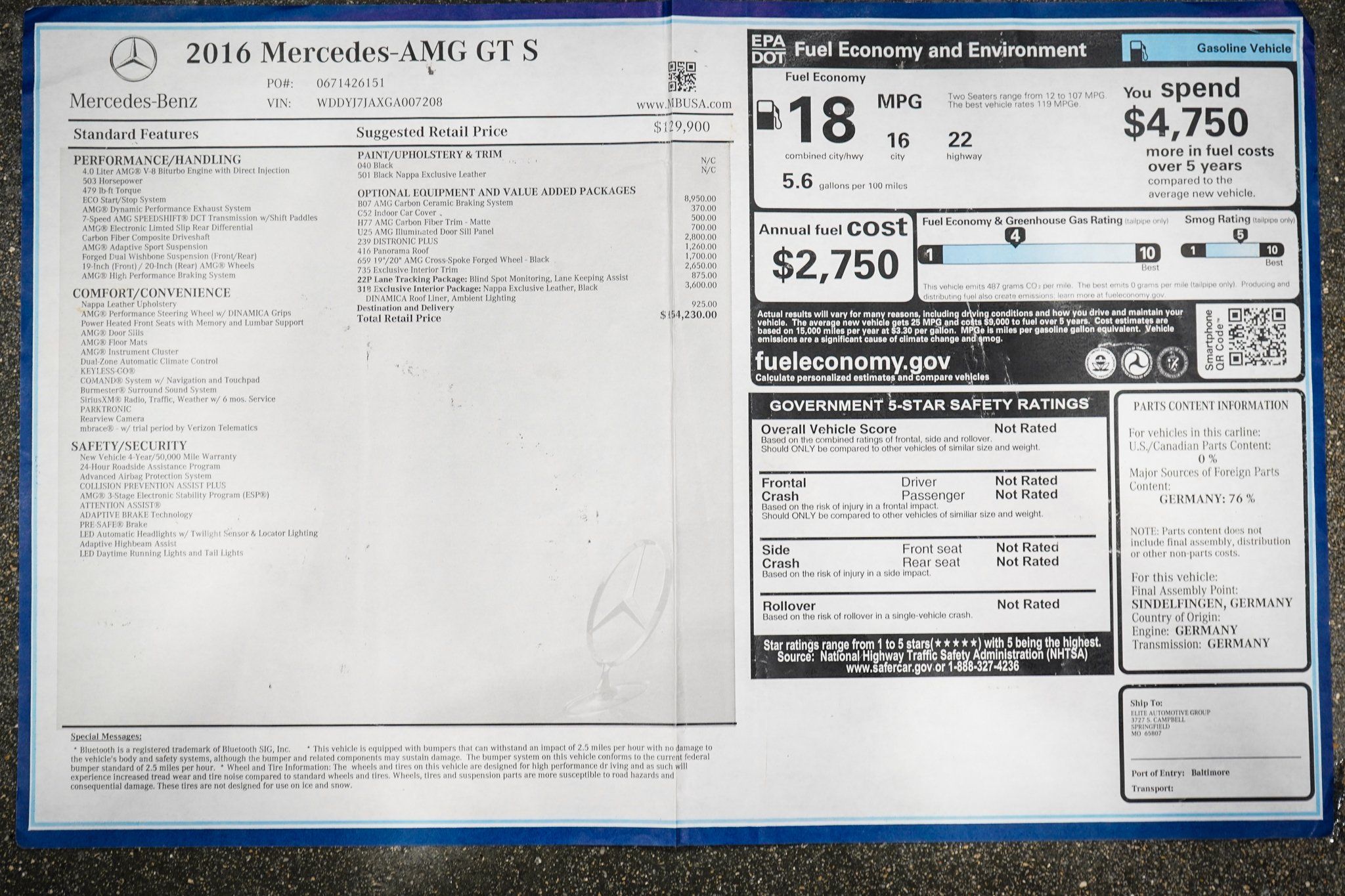 FREE NATIONWIDE ENCLOSED DELIVERY! ON SALE NOW! RARE CERAMIC BRAKES! HUGE MSRP OF $154,230 NEW! LOCAL TRADE! PERFECT HISTORY! THIS IS NOT YOUR AVERAGE BASE AMG GT S! HIGHLY OPTIONED! ONLY 2K MILES! THE AMG GT S COMES WITH A PERFECT CERTIFIED CARFAX AND AUTOCHECK HISTORY REPORT! R3 MOTORCARS IS PROUD TO PRESENT THIS GOREOUS 2016 MERCEDES AMG GT S COUPE! THE BLACK EXTERIOR AND EXCLUSIVE BLACK NAPPA LEATHER INTERIOR ARE SHOWROOM NEW. I'VE DRIVEN EVERY LUXURY PERFORMANCE CAR OUT THERE, AND THIS IS BY FAR THE MOST BANG FOR YOUR BUCK! GET'S NO BETTER THAN THE LUXURY, TECHNOLOGY AND PERFORMANCE OF THIS CAR! 503HP WITH 479TQ! EQUIPPED WITH FACTORY OPTIONS INCLUDING AMG CARBON CERAMIC BRAKES ($8,950), EXCLUSIVE INTERIOR PKG ($3,600), DISTRONIC PLUS ($2,800), EXCLUSIVE INTERIOR TRIM ($2,650), 19/20 AMG CROSS-SPOKE FORGED WHEELS IN BLACK ($1,700), PANORAMA ROOF ($1,260), LANE TRACKING PKG ($875), AMG ILLUMINATED DOOR SILL PANEL ($700), AMG CARBON FIBER TRIM IN MATTE ($500), BOOKS, BOTH KEYS, ORIGINAL WINDOW STICKER AND MORE! SUPER COMPETITIVE FINANCING RATES AVAILABLE WITH APPROVED CREDIT. PLEASE CALL ME WITH ANY QUESTIONS. THANKS.